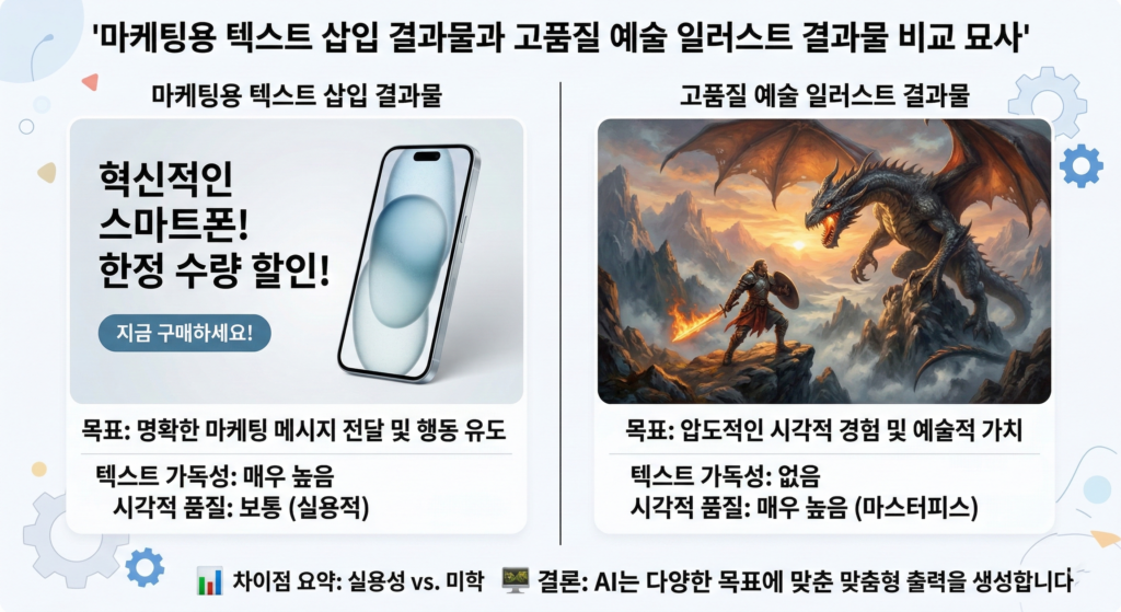 상업적인 포스터, SNS 썸네일, 프레젠테이션 자료를 만든다면 전자를 추천해 드립니다. 이 툴의 가장 무서운 강점은 바로 그림 안에 들어가는 ‘글씨(Text)’를 정확히 묘사하는 거예요. 간판이나 네온사인에 원하는 알파벳을 오타 없이 깔끔하게 합성하는 능력이 정말 뛰어납니다. 마케터나 콘텐츠 크리에이터 입장에서는 추가 포토샵 작업 시간을 엄청나게 줄일 수 있죠.