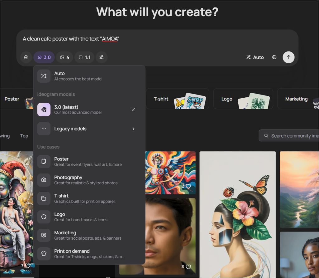 처음에는 만들고 싶은 이미지를 영어로 짧게 적는 게 가장 편합니다. 예를 들어 카페 포스터를 만들고 싶다면 문장 끝에 넣고 싶은 글자를 따옴표로 묶어 넣어보세요. 화면에 보이는 Auto는 알아서 맞는 모델을 골라주는 옵션이고, 3.0은 직접 최신 모델로 고정해서 만드는 방식입니다. 처음엔 Auto로 시작해도 되고, 결과를 더 또렷하게 보고 싶으면 3.0으로 바꿔보면 됩니다.