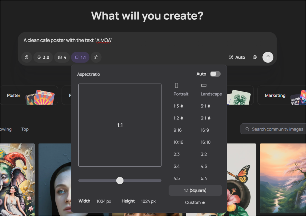 화면에 보이는 Poster, Logo, Marketing 같은 항목은 결과 느낌을 빠르게 바꾸는 선택지입니다. 포스터 느낌이면 Poster, 배너나 광고 이미지면 Marketing 쪽이 더 잘 맞는 경우가 많습니다. 실제로 웹사이트나 썸네일 느낌을 보고 싶다면 Marketing으로 바꾸고 비율도 16:9로 맞춰보세요.