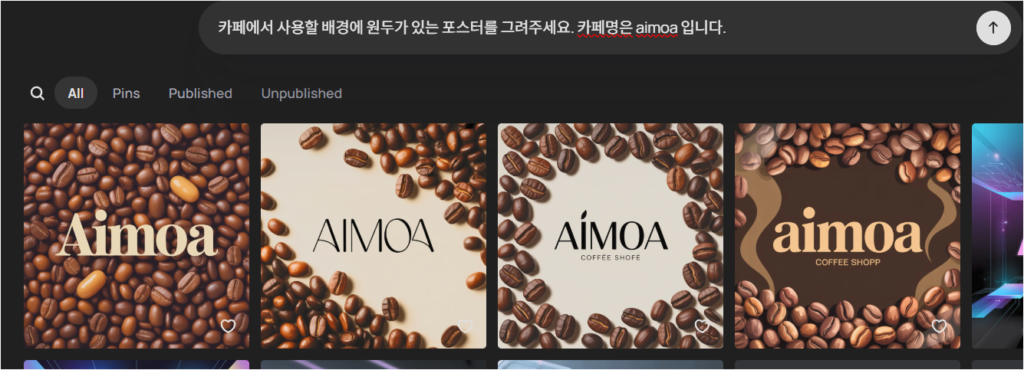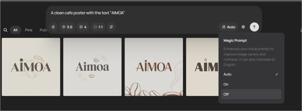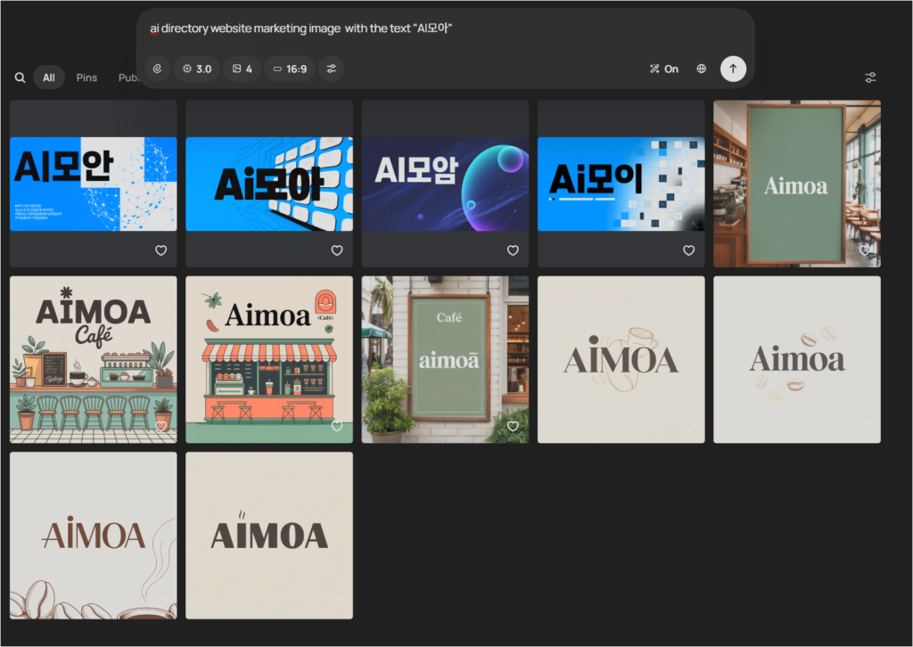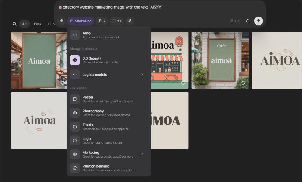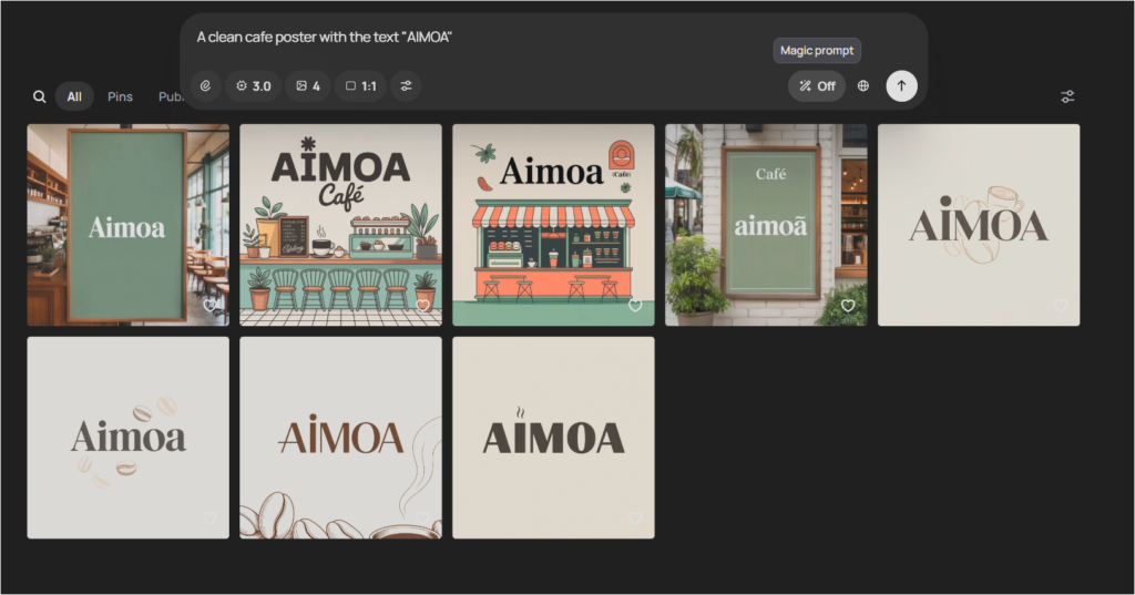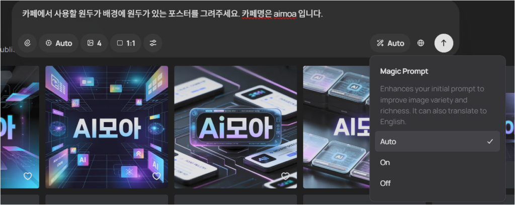 Magic Prompt는 내가 쓴 프롬프트를 더 풍성하게 바꿔주는 기능입니다. Auto는 자동으로 보정해주고, Off는 내가 쓴 문장을 최대한 그대로 반영하려는 쪽입니다. 글자나 문구를 정확히 보고 싶을 때는 Off로도 한번 비교해보는 게 좋습니다. Ideogram은 글자가 강점이지만, 문구가 길어질수록 깨질 수 있어서 처음엔 짧은 단어부터 테스트하는 게 안전합니다. ai모아의 영어명인 aimoa로 카페가 생긴다면 어떤 포스터가 어울릴까 하고 진행해봤습니다ㅋㅋ.
